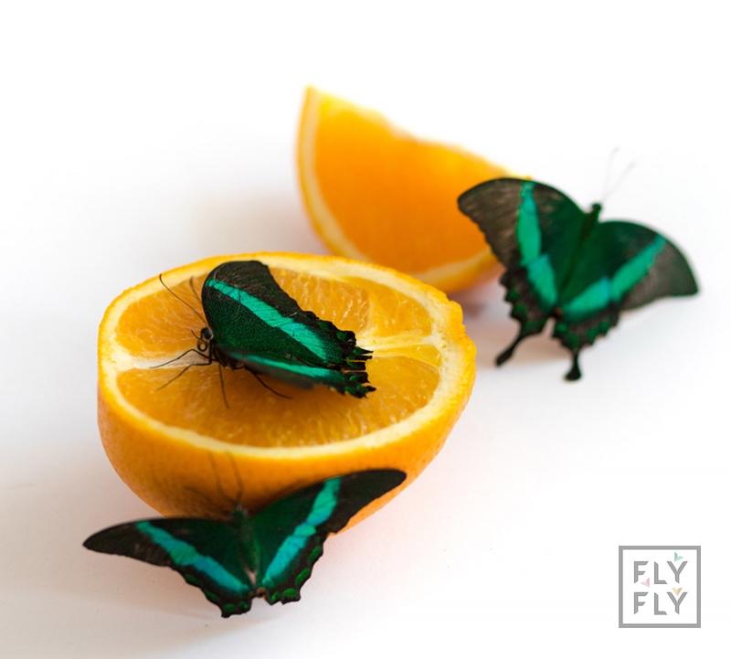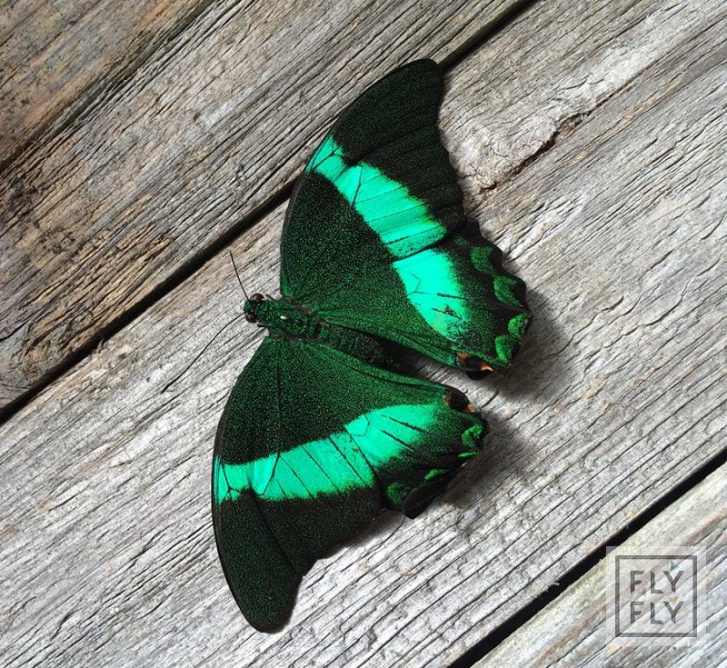 Размах крыльев до 12 см. Основной цвет крыльев - черный, с яркими малахитовыми полосами и точками. Полет быстрый. Идеальна как для салютов, так и в качестве подарка сама по себе. Живет до полутора недель.